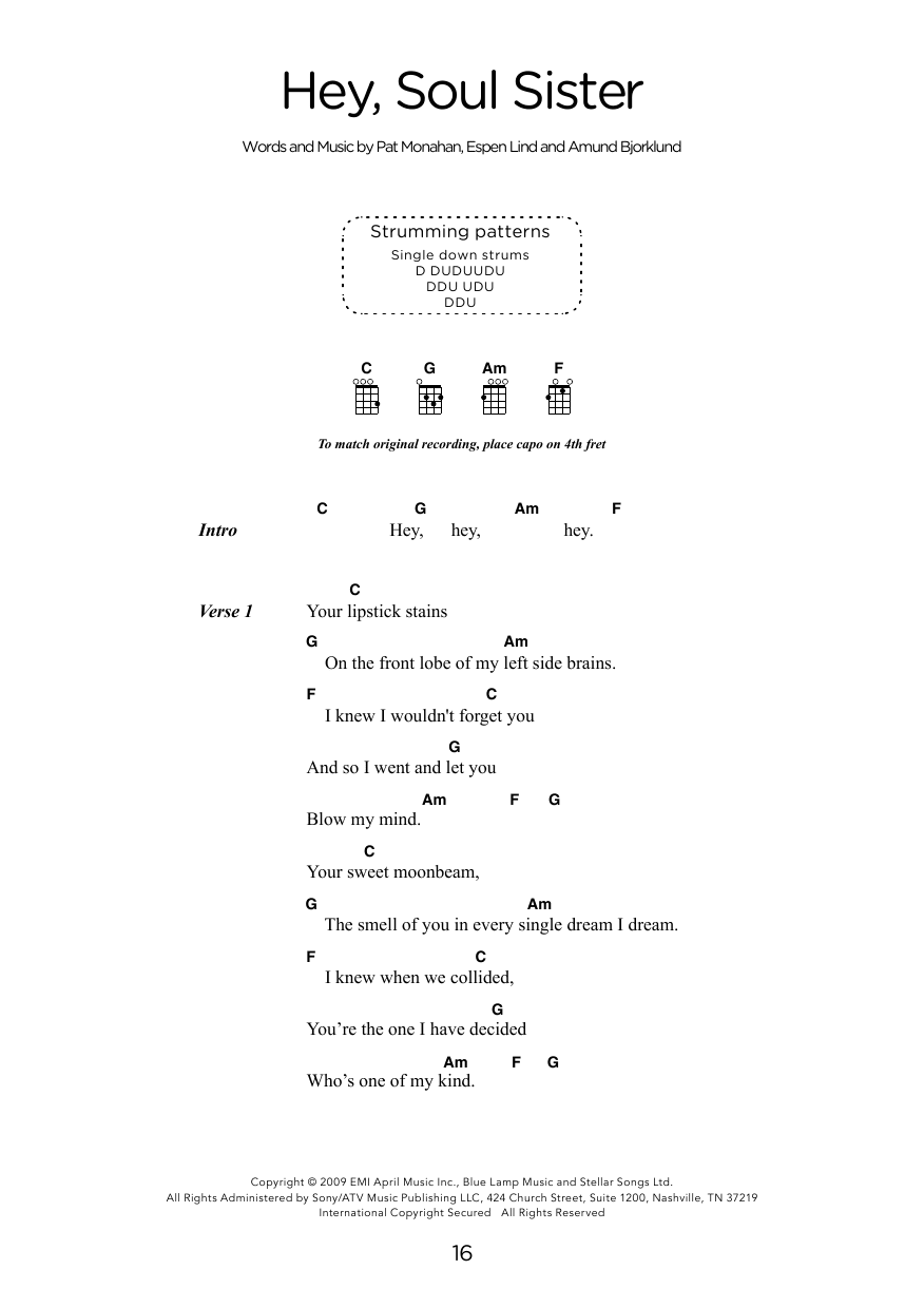 The strumming pattern gives ‘Hey Soul Sister’ its bouncy, catchy vibe. Beginner ukulele players often start with simpler patterns: